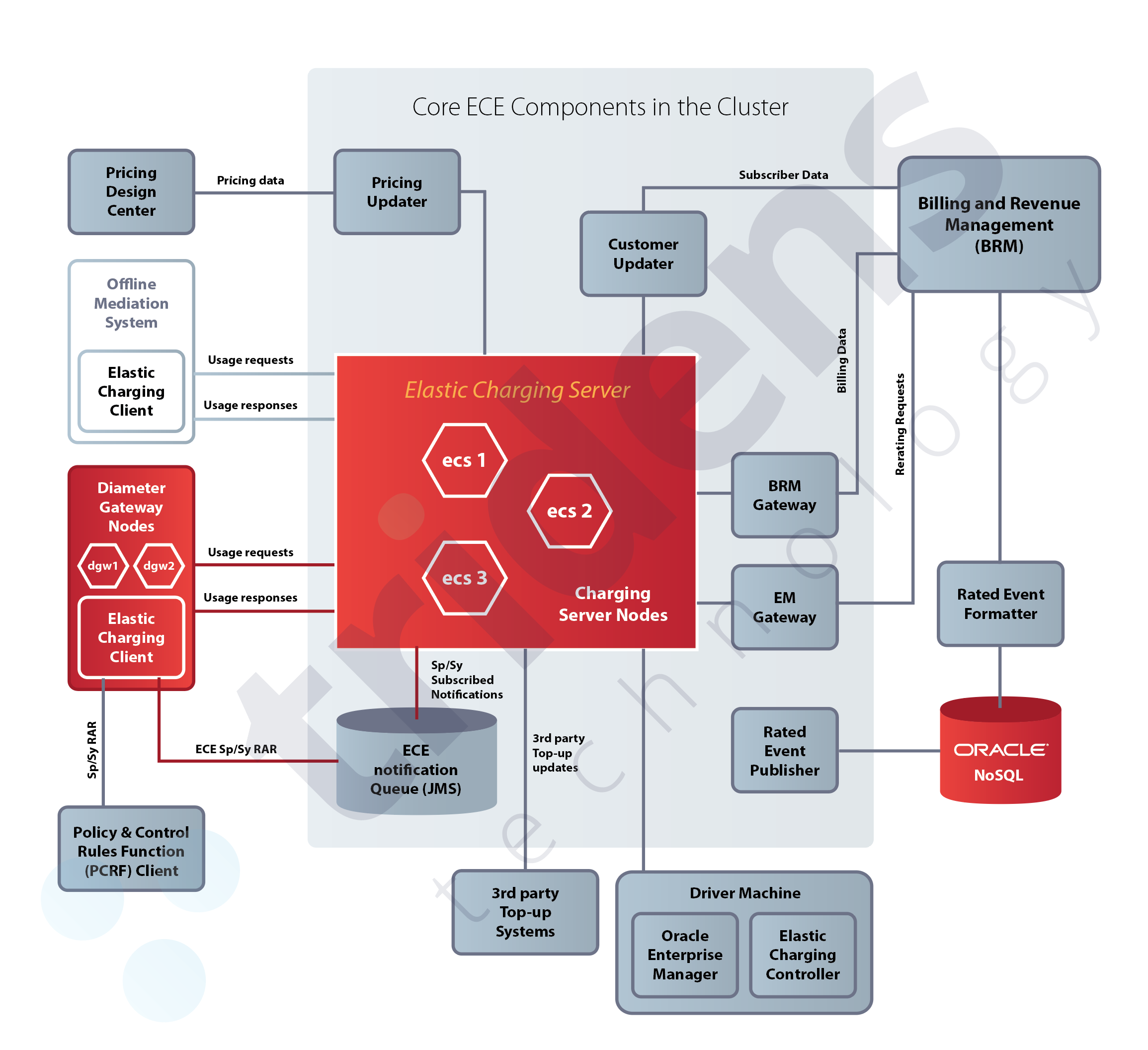 - Elastic Charging Engine - est le principal moteur d'évaluation pour la facturation en ligne et hors ligne du système BRM. ECE est très évolutif car il exploite Oracle Coherence, une solution de grille de données en mémoire. Il peut traiter jusqu'à plusieurs milliers de transactions par seconde. Il dispose également d'un composant de passerelle de diamètre intégré qui peut traiter les demandes provenant du réseau.